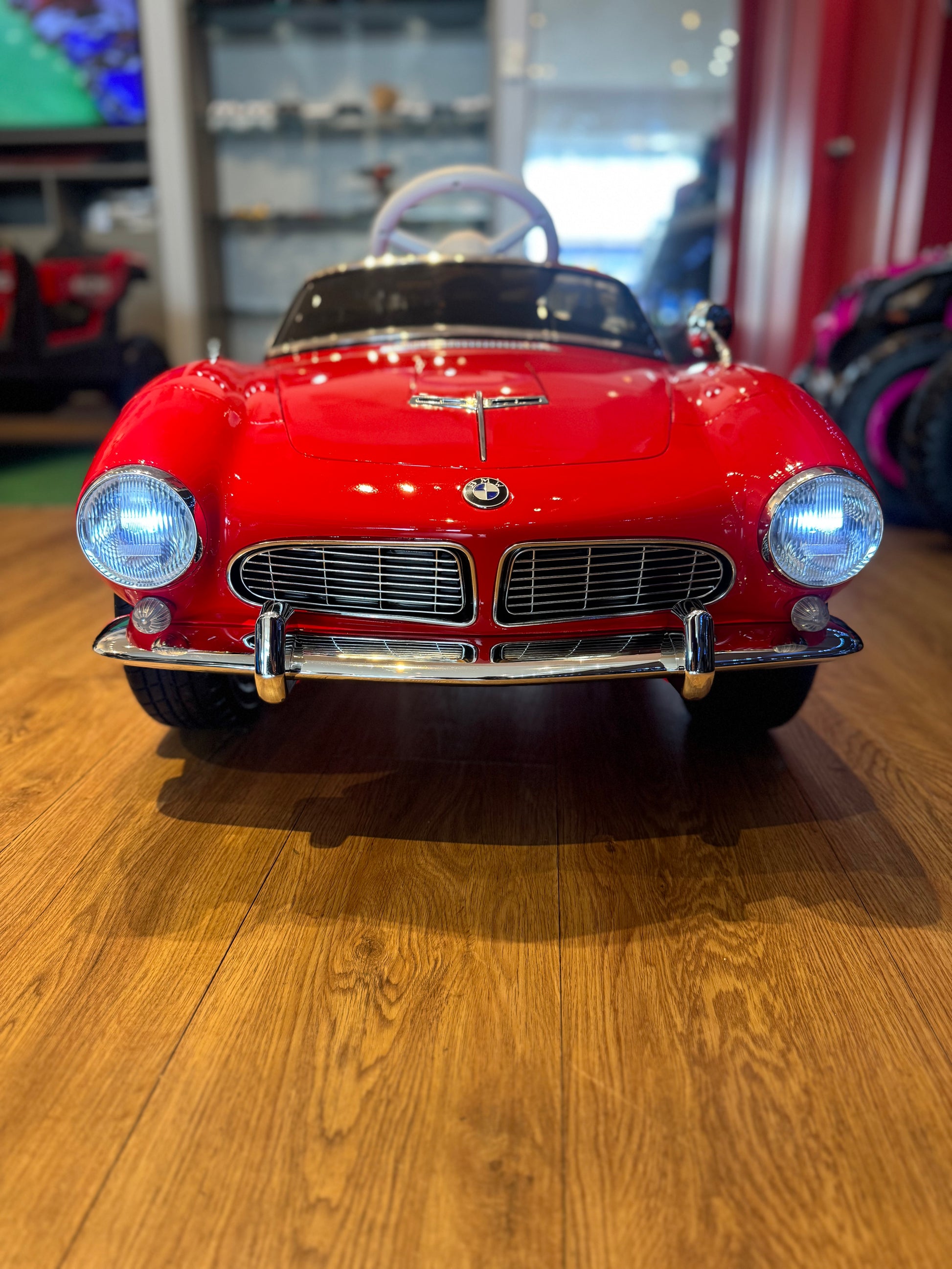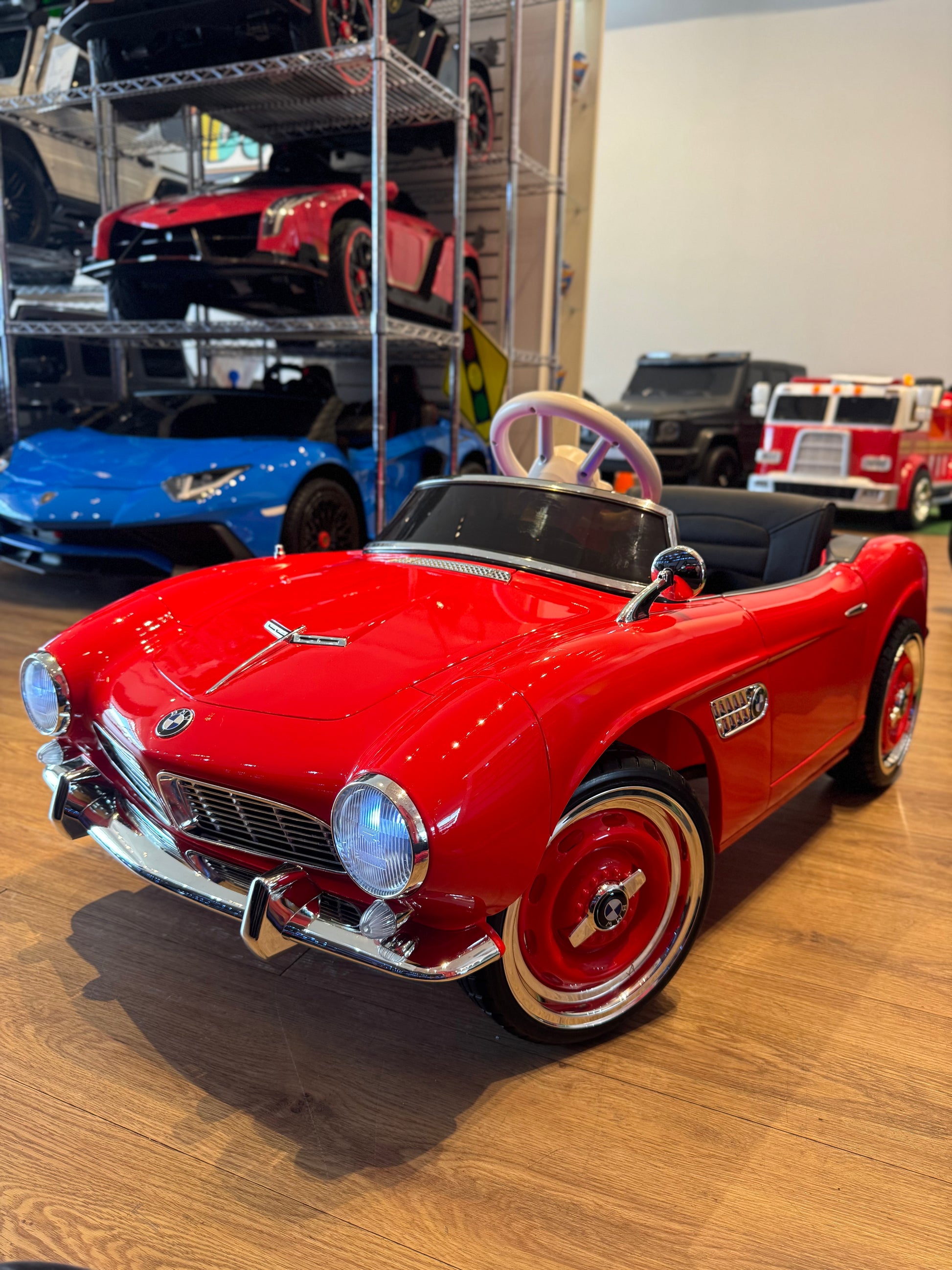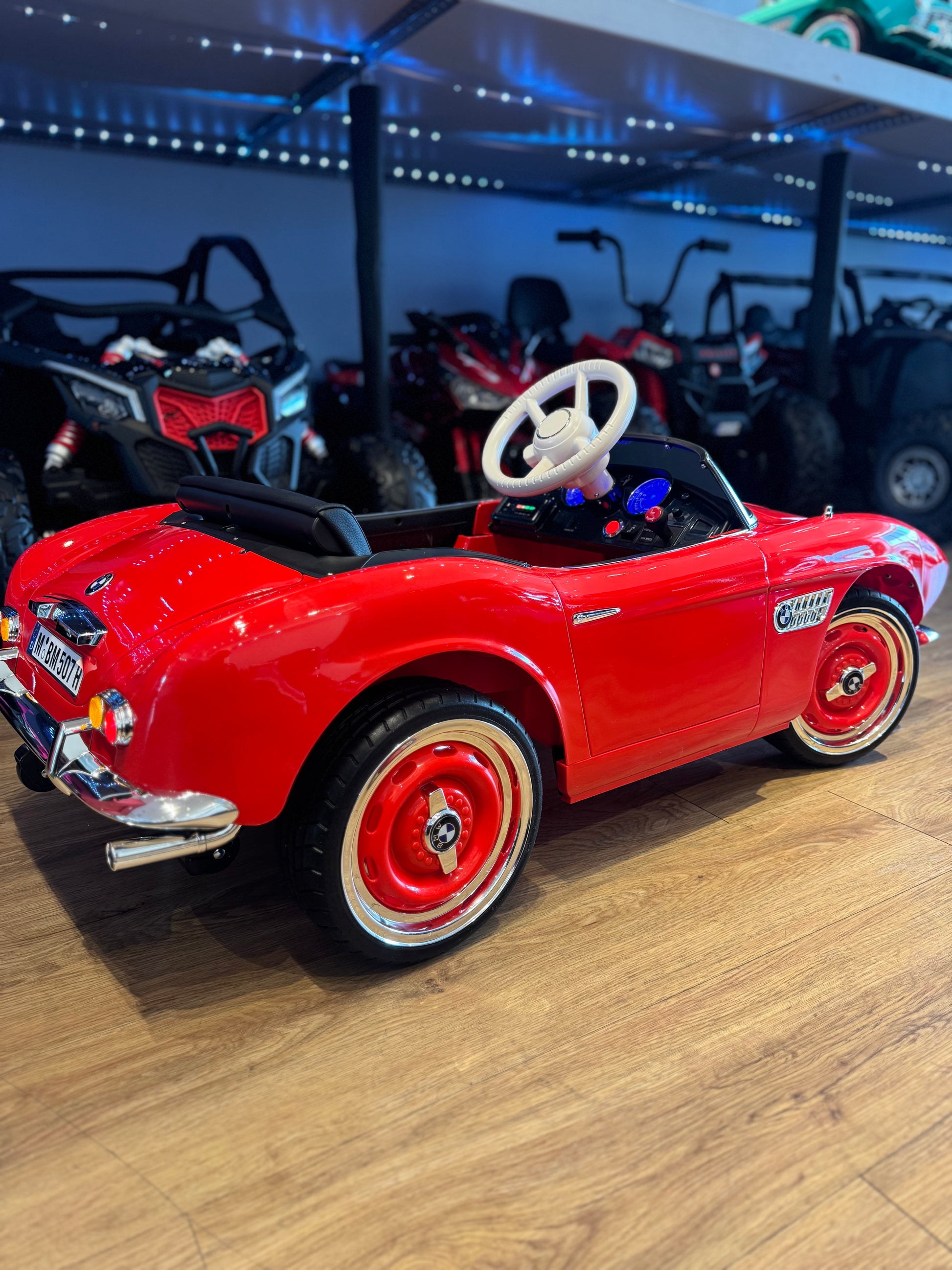 BMW 507 clásico para niños. Precioso cochecito para bebés. Tiene todos los detalles cromados en todo el coche que están basados en el coche real. Este BMW tiene licencia oficial.